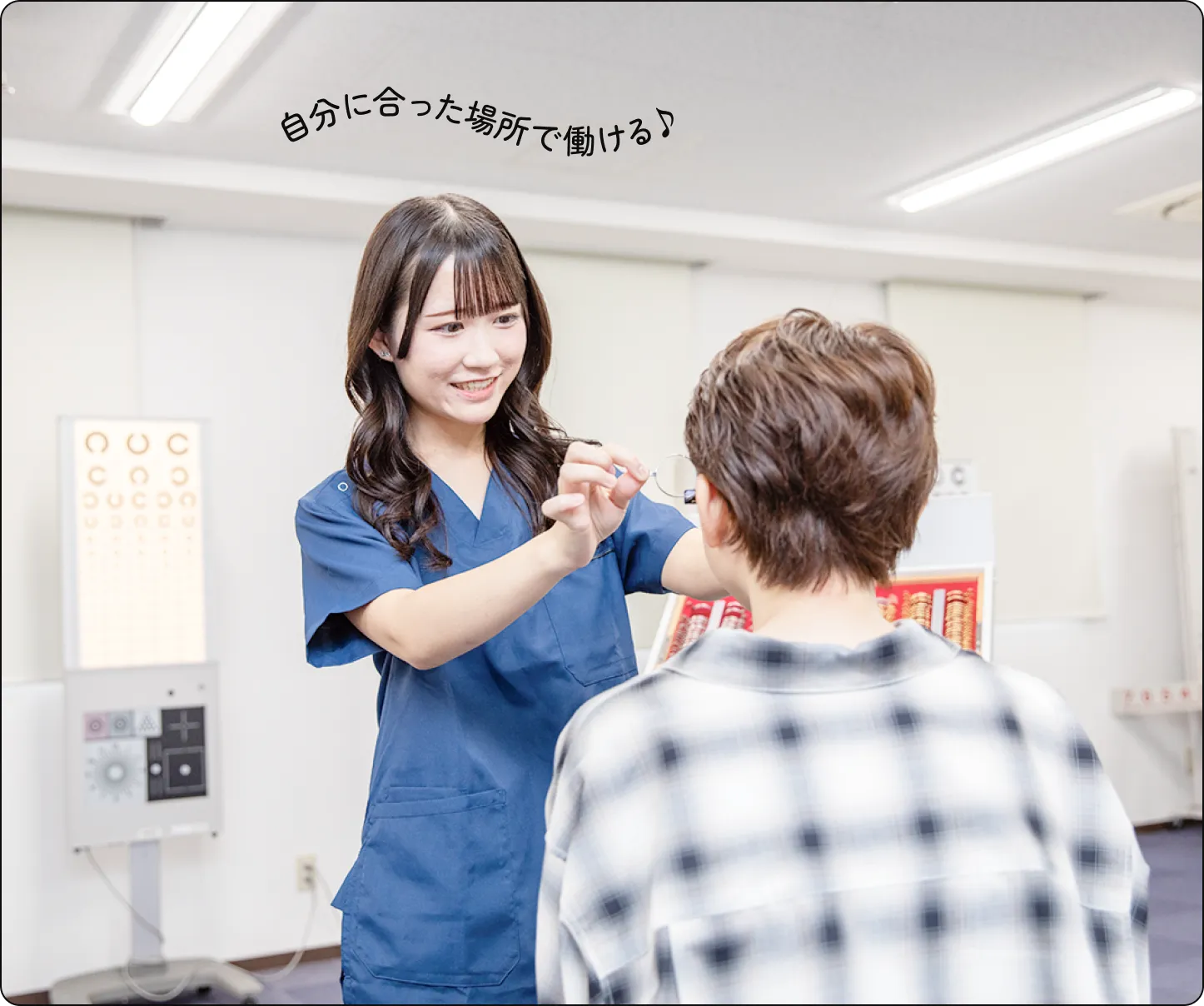 視能訓練士は昼間の外来中心の職場が多く、夜勤になりにくい仕事です。私生活と両立しやすくライフスタイルが変わっても安心です。