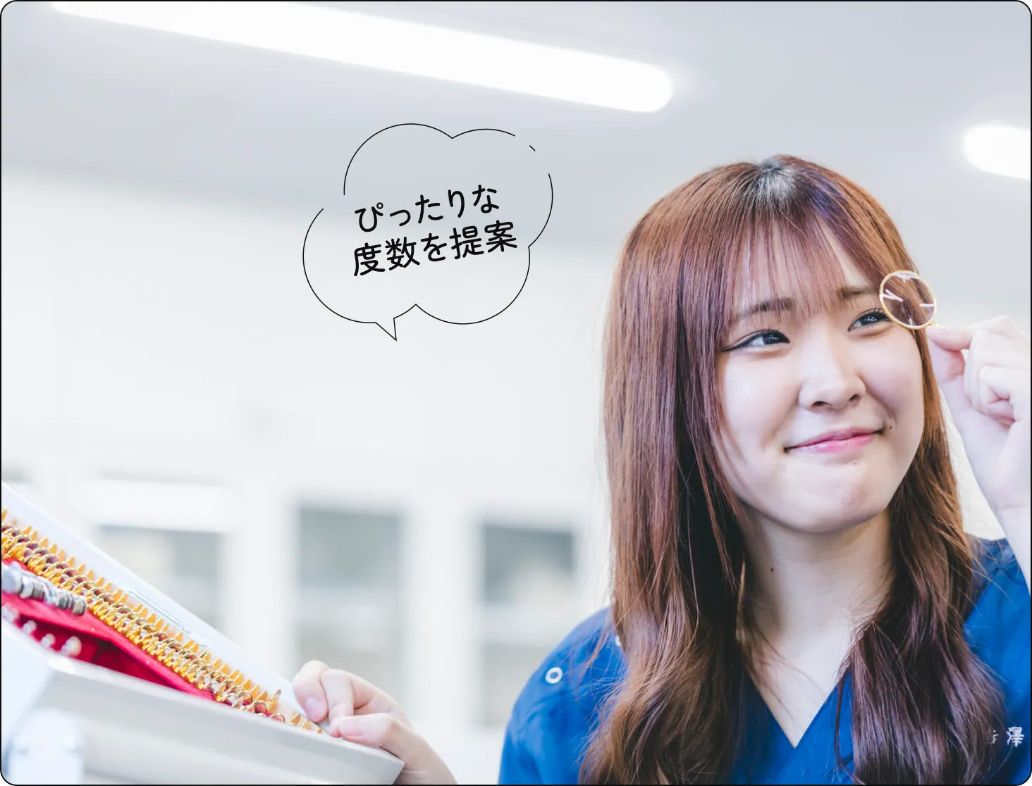 どんなレンズが合うかチェック! 一人ひとりの目の状態を調べて、いちばん見やすいメガネやコンタクトの度数を見つけます。